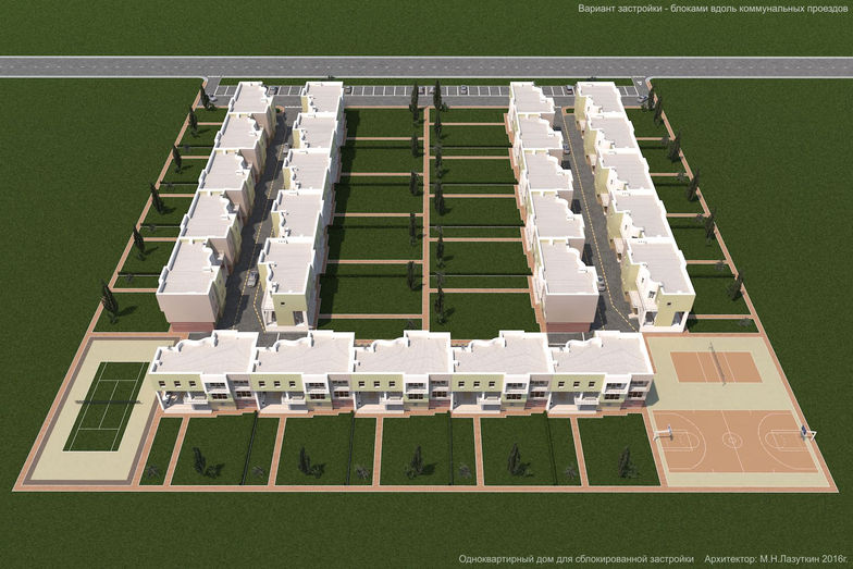 Генплан разработан на основе проекта таунхауса у которого все спальни и другие помещения для отдыха вынесены на сторону дома где нет автодороги. Это позволяет формировать широко применяемую в США компактную застройку таунхаусами по схеме вдоль коммунальных проездов. Автомобильный и пешеходный потоки полностью разделяются, отгораживаются друг от друга блоками домов. Это не только существенно экономит территорию, а и обеспечивает безопасность детей, играющих в садовой зоне на пешеходной стороне блока. В результате такой разбивочной схемы таунхас имеет два входа – один вход с пешеходной стороны блока и второй вход с автомобильной стороны блока.