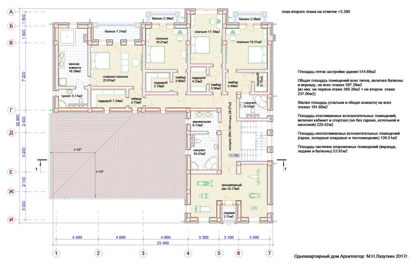 Особенности проекта: Все спальни и другие помещения для отдыха вынесены на сторону где нет автодороги - нет шума и выхлопных газов. Дом отвечает требованиям к комфорту современных одноквартирных домов развитых стран, домов классов Single Family Home США. Дом оборудован летней кухней-столовой на первом этаже. Стилистика фасадов выдержана в современной американской интерпретации Георгианского стиля, популярного в США и других англоязычных странах.