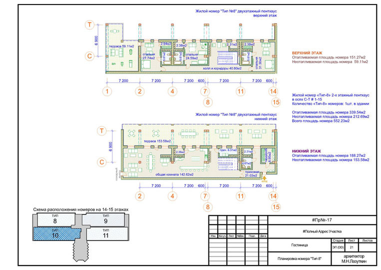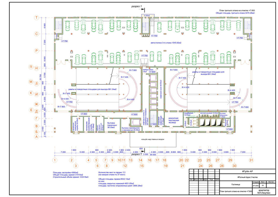 Ниже представлены: Планировки жилой части, чертежи и иллюстрации; Планы всех этажей включая рестораны, фитнес-центр, гараж, админ-бытовую часть и другое; Фасады и разрезы.
