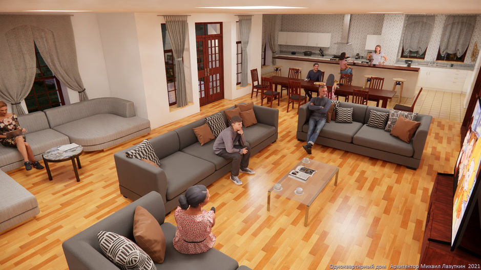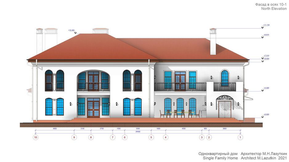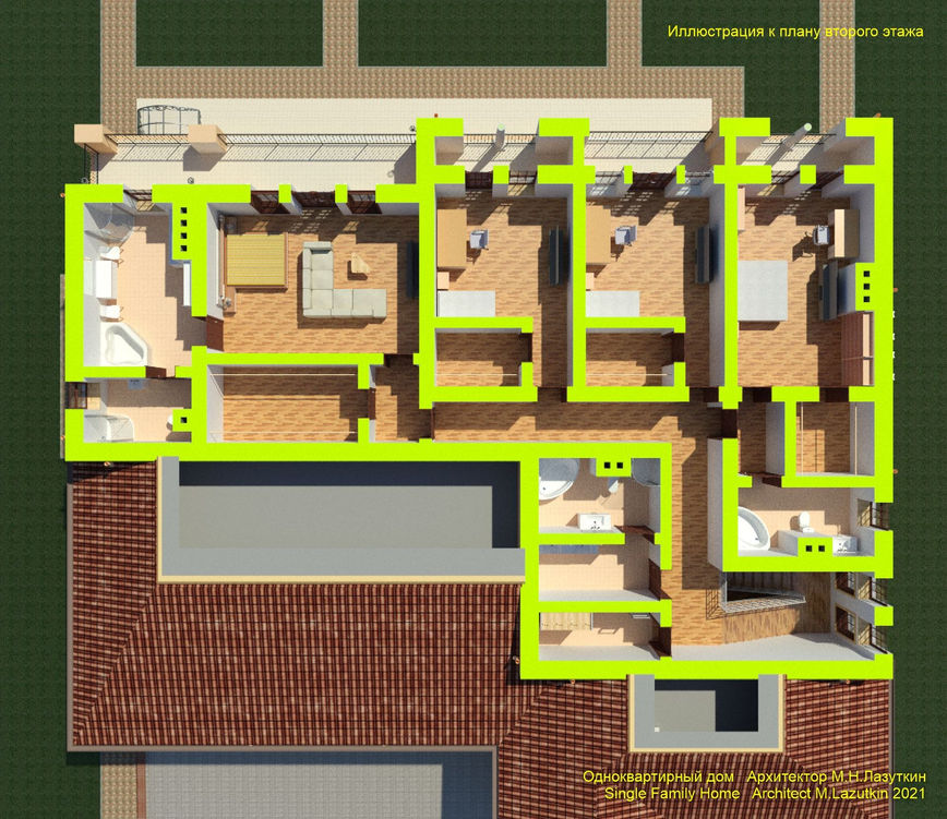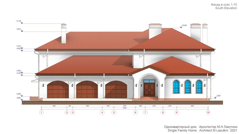 Особенности проекта: Все спальни и другие помещения для отдыха вынесены на сторону двора где нет автодороги. Дом отвечает требованиям к комфорту современных одноквартирных домов развитых стран, домов классов Single Family Home США. Дом оборудован летней кухней-столовой на веранде на первом этаже. Стилистика фасадов выдержана в современном испанском стиле США - Spanish Colonial Revival Style, особо популярном в Калифорнии и Флориде.